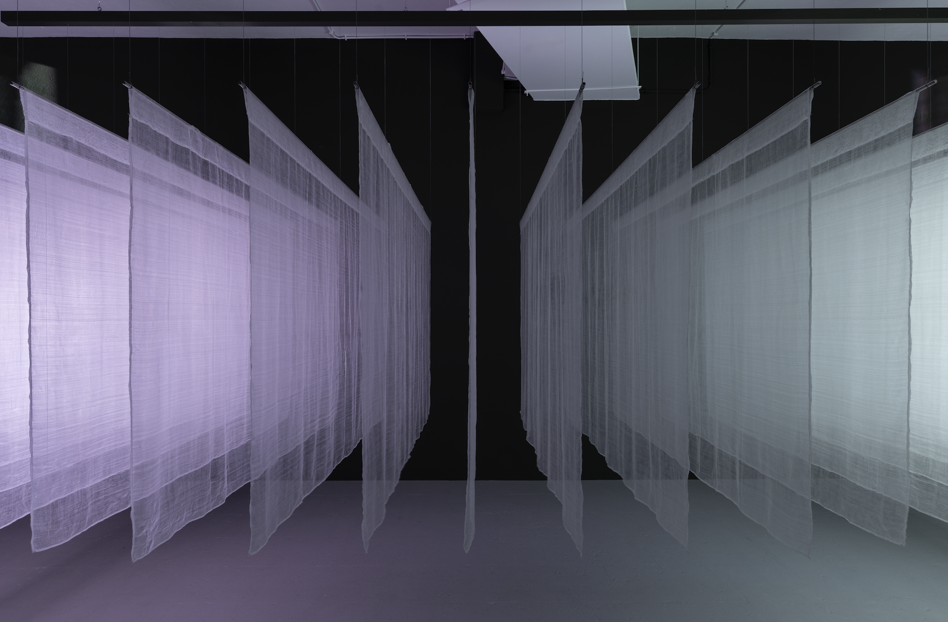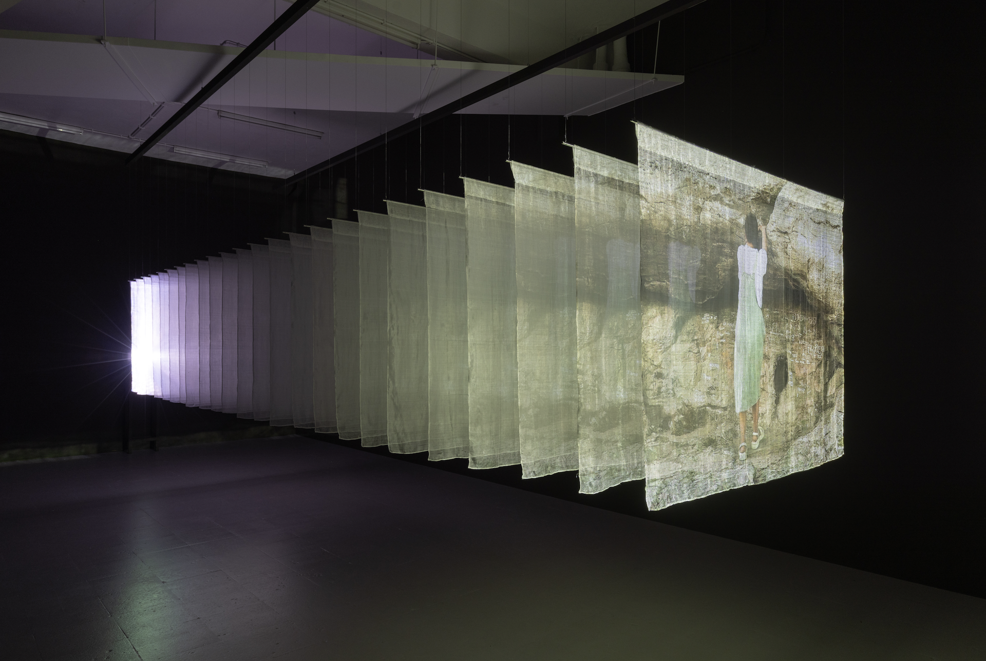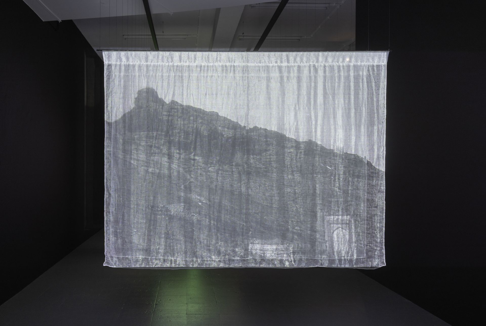 Without voice-over or didactic captions, Ismailova seamlessly weaves archival footage of rituals performed on the different parts of the mountain, dating back to as early as 1929, featuring early Soviet ethnographic field expedition scenes alongside contemporary observational shots of the museum interior and the surrounding landscape. The 19-minute film is projected onto twenty-four suspended silk panels, which are made in Margilan, one for each frame per second, so that images and landscape observations shift and fade as viewers walk through the space.