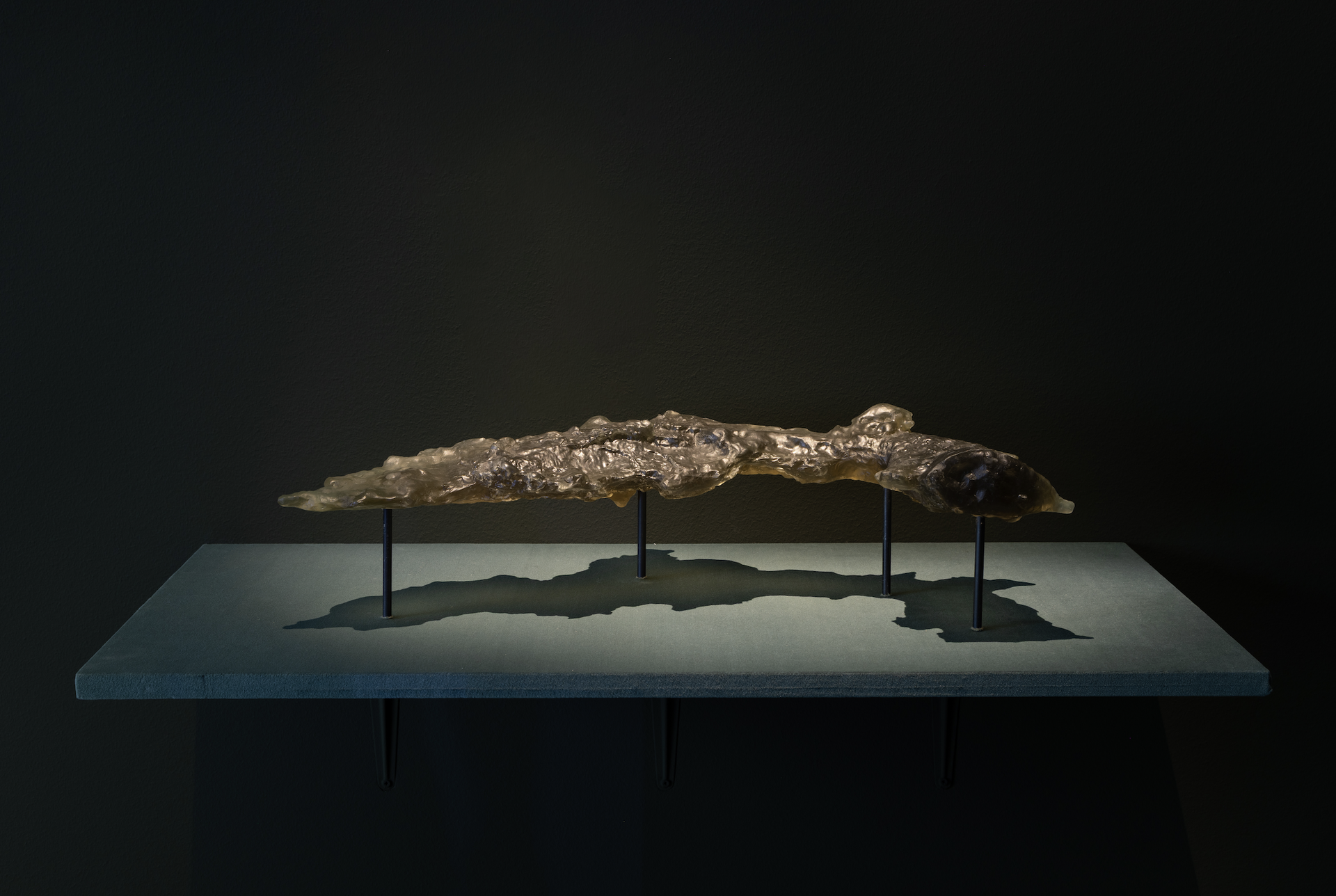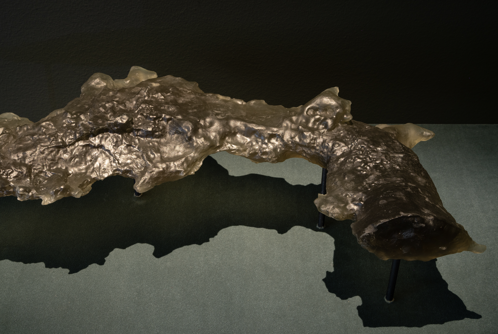 Alongside the film, the exhibition features "The Mountain Our Bodies Emptied," a reduced-scale resin cast based on LiDAR (Light Detection and Ranging) scans, a technology that uses laser light to create precise three-dimensional models of surfaces, of Tamchi Tomar Cave, the most active and venerated cave in the mountain. Together with the film, the sculpture extends Ismailova’s reflection on the significance ingrained in sacred sites, where physical and spiritual presence, collective memories, and cultural impositions leave their marks even as their meanings are contested.